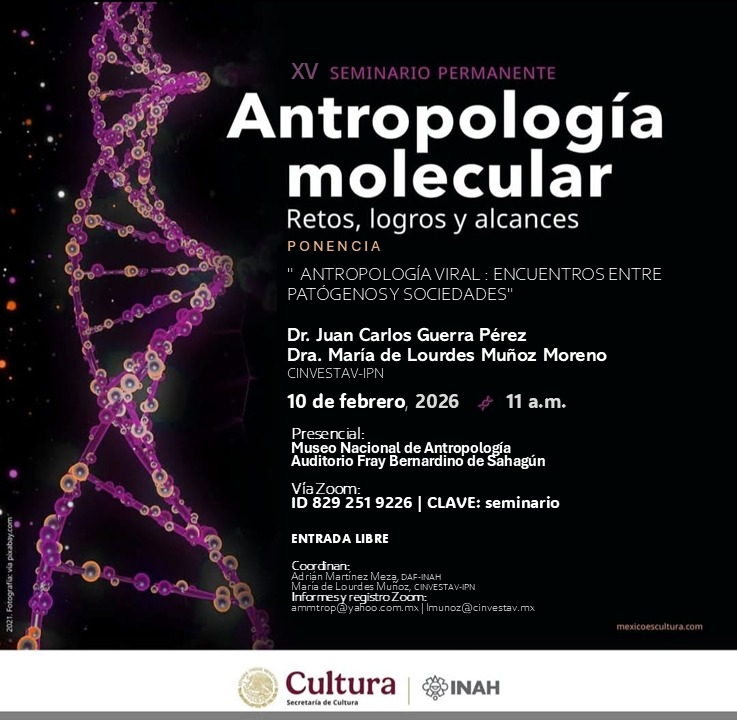 2024-10-21La Dirección de Antrpologia Fisica por medio de su Seminario permanente Antropología molecular complace en invitar el proximo 21 de octubre en el Museo Nacional de Antropologia a las 11 a...